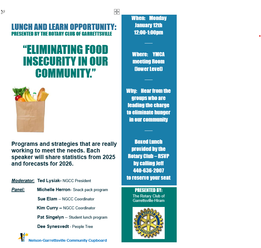 Please join us for this lunch and learn to hear from the people who work hard to make sure our community is able to get the food they need. We are truly blessed to have such a giving community who care for one another. RSVP to Jeff at 440-636-2007. We look forward to seeing you!